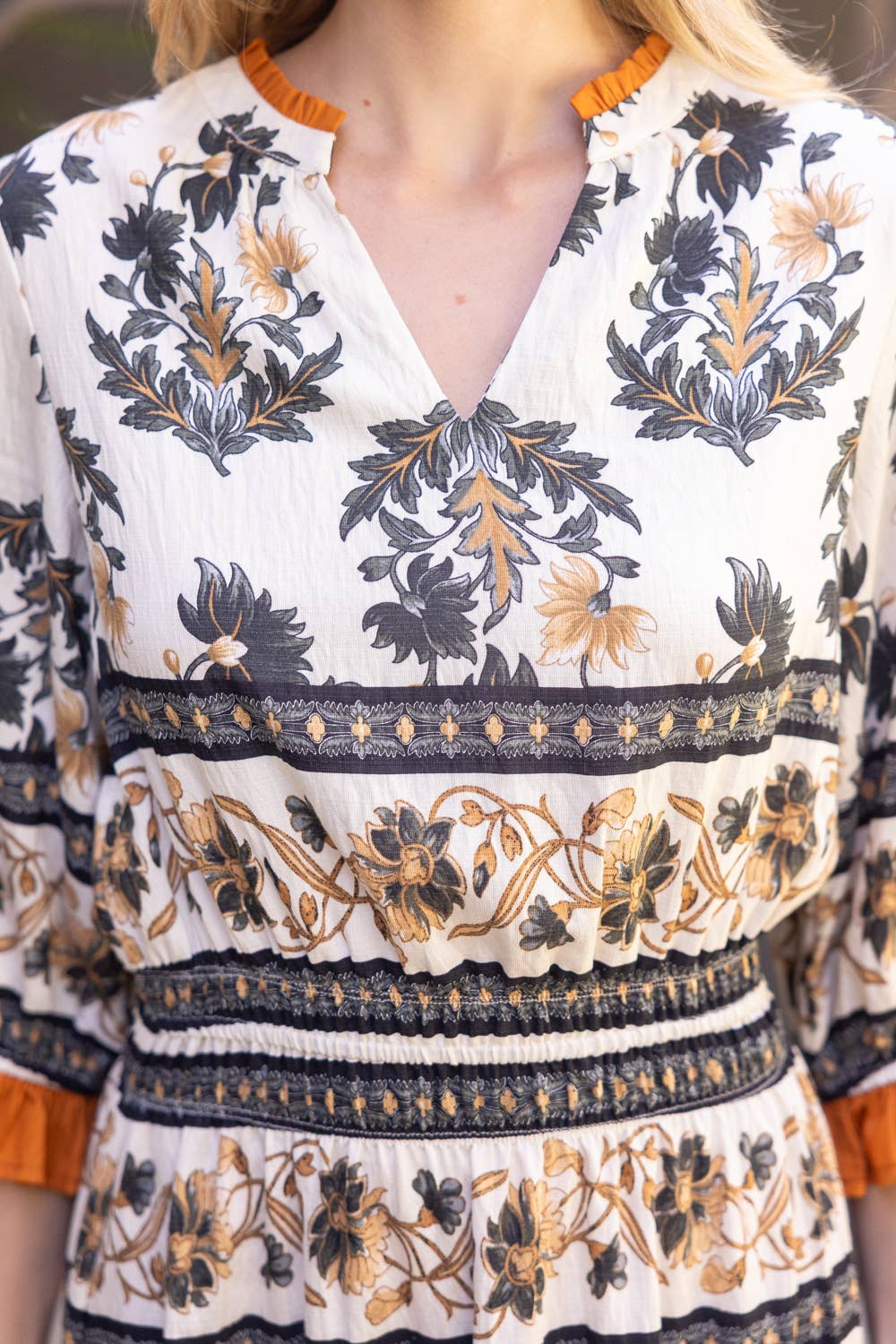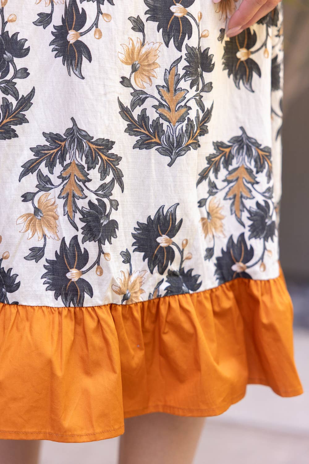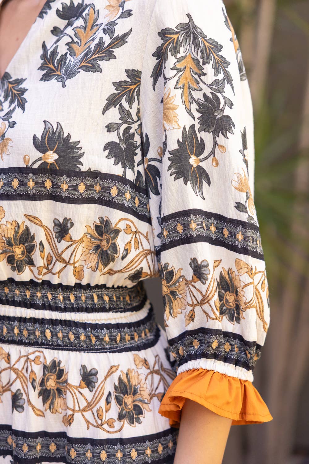 35864 Contrast Ruffled Cuff and Hem Floral Boarder Midi Dres: Cream / S
