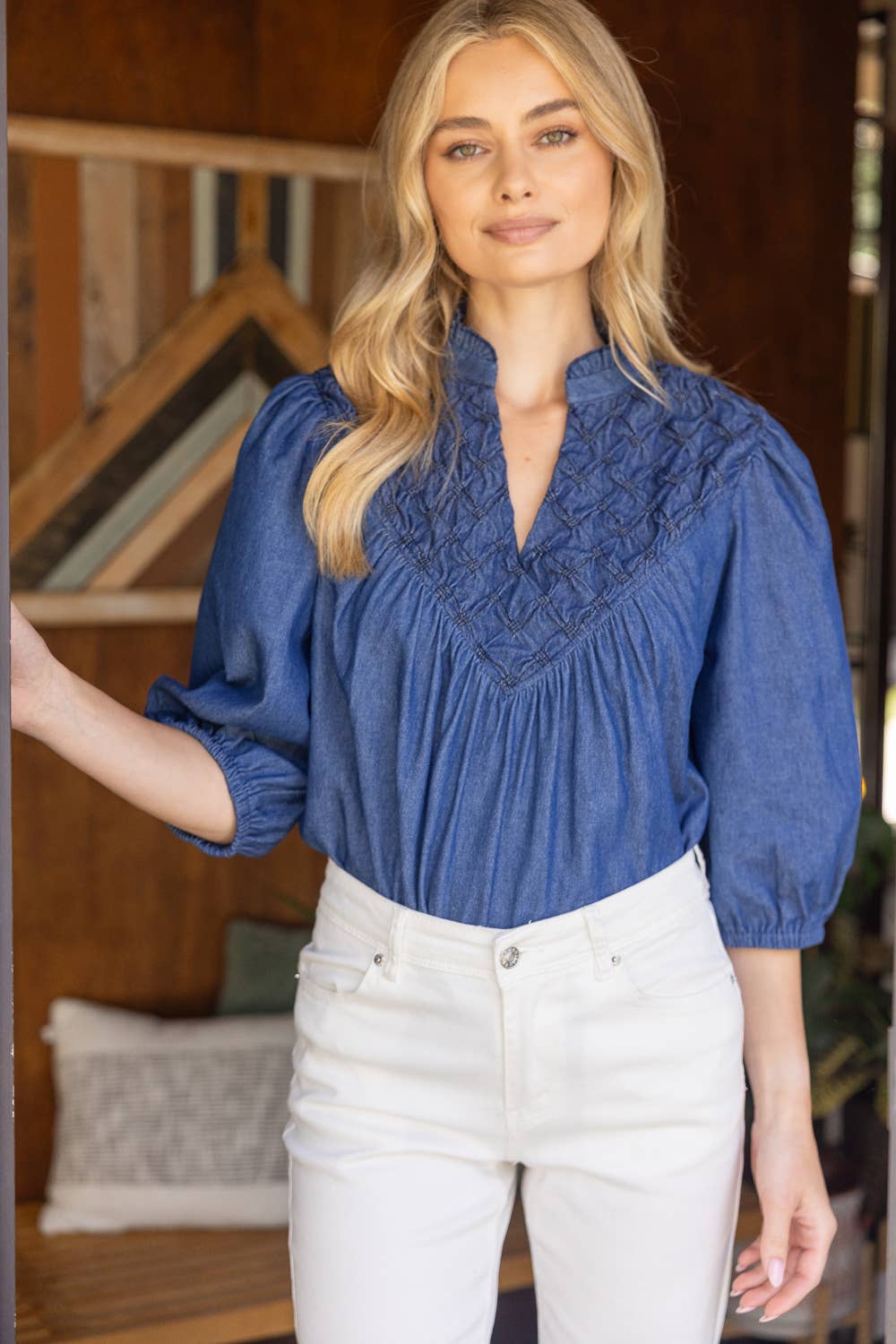 35871 Diamond Textured Yoke Quarter Puff Sleeve Top: Denim Blue / L