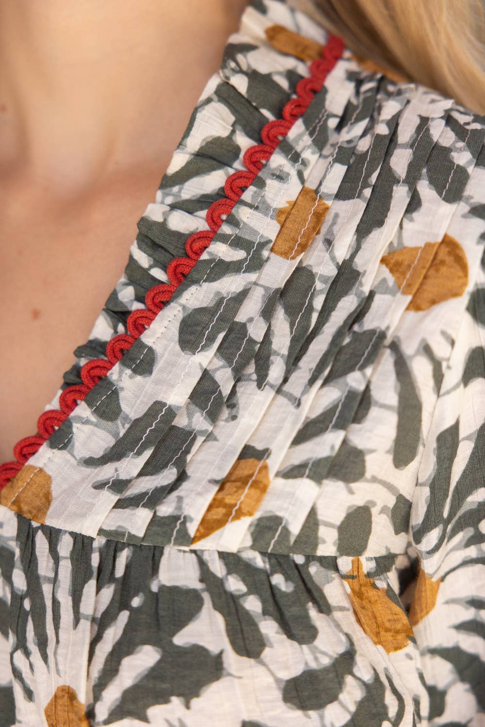36068 Ruffled V Neck and Trim Detail Printed Top: Olive / S