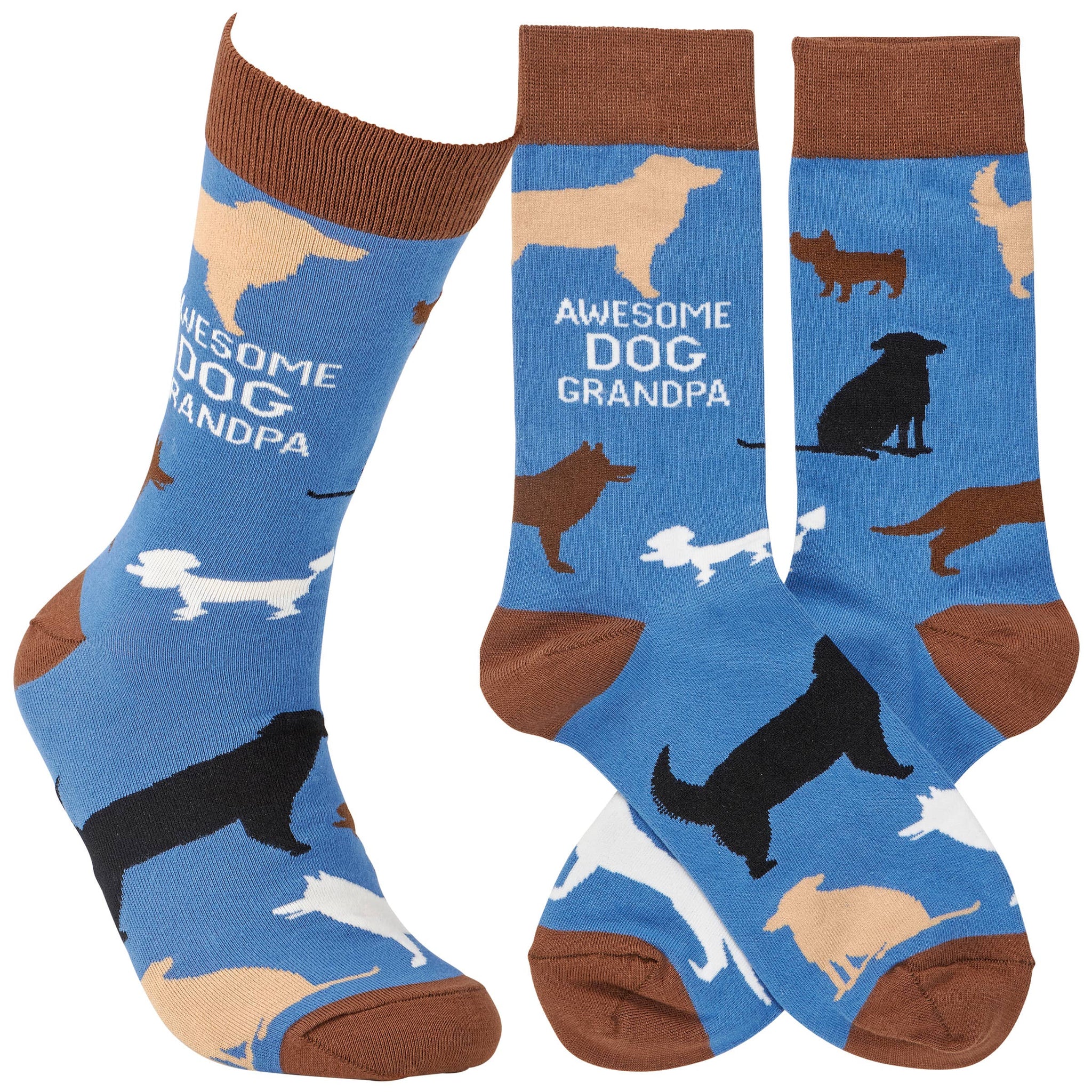 A pair of colorful socks from our Pet Collection displaying unique hand illustrated designs of different dogs with a fun sentiment that reads "Awesome Dog Grandpa." Socks feature a one size fits most design made with cotton, nylon, and spandex. Our Awesome Dog Grandpa socks come with a header card and a clear plastic hanger for display. A fun pet-themed gift perfect for everyday self-expression.