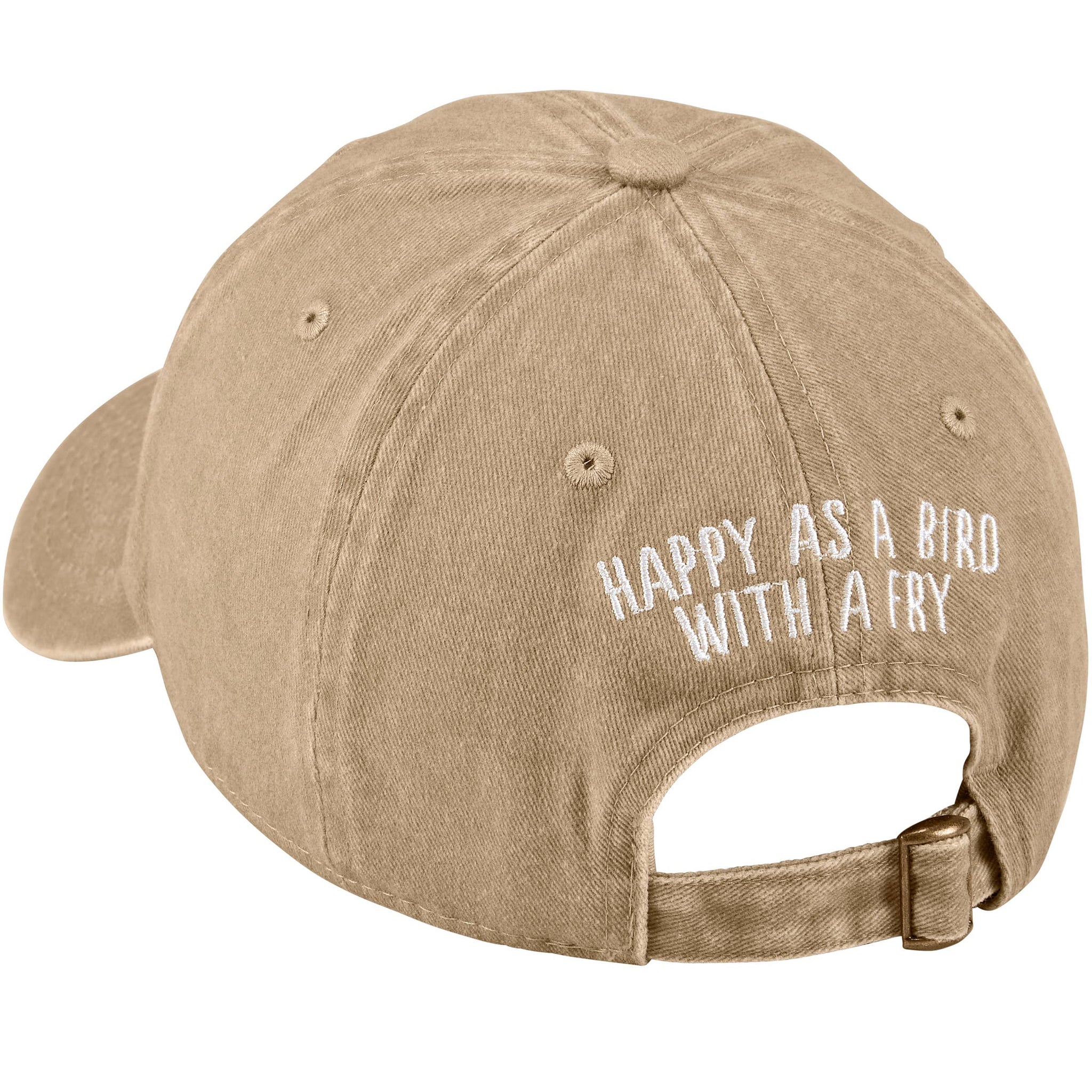 A sand-colored baseball cap from our Beach Collection displaying an intricate design of a seagull holding a french fry in its mouth with a fun beach-themed sentiment on the back that reads "Happy As A Bird With A Fry." Cap features embroidered sentiment and design for added detail. Our Bird baseball cap is one size fits most with an adjustable buckle closure to create the perfect fit. A fun beach day accessory perfect for everyday use. Hand wash only.