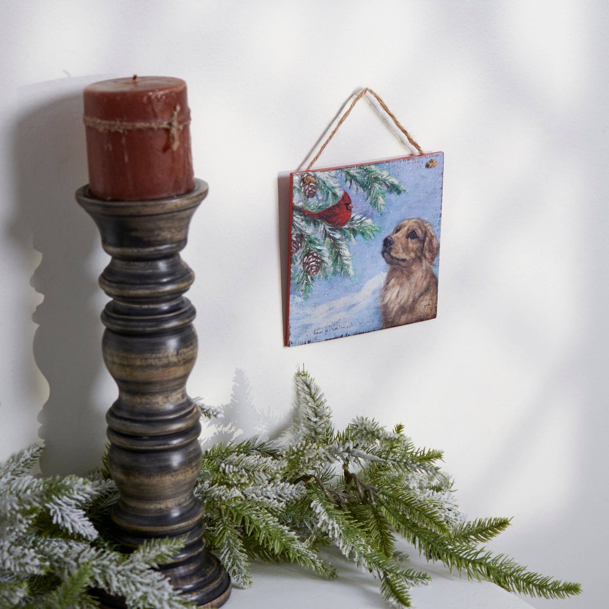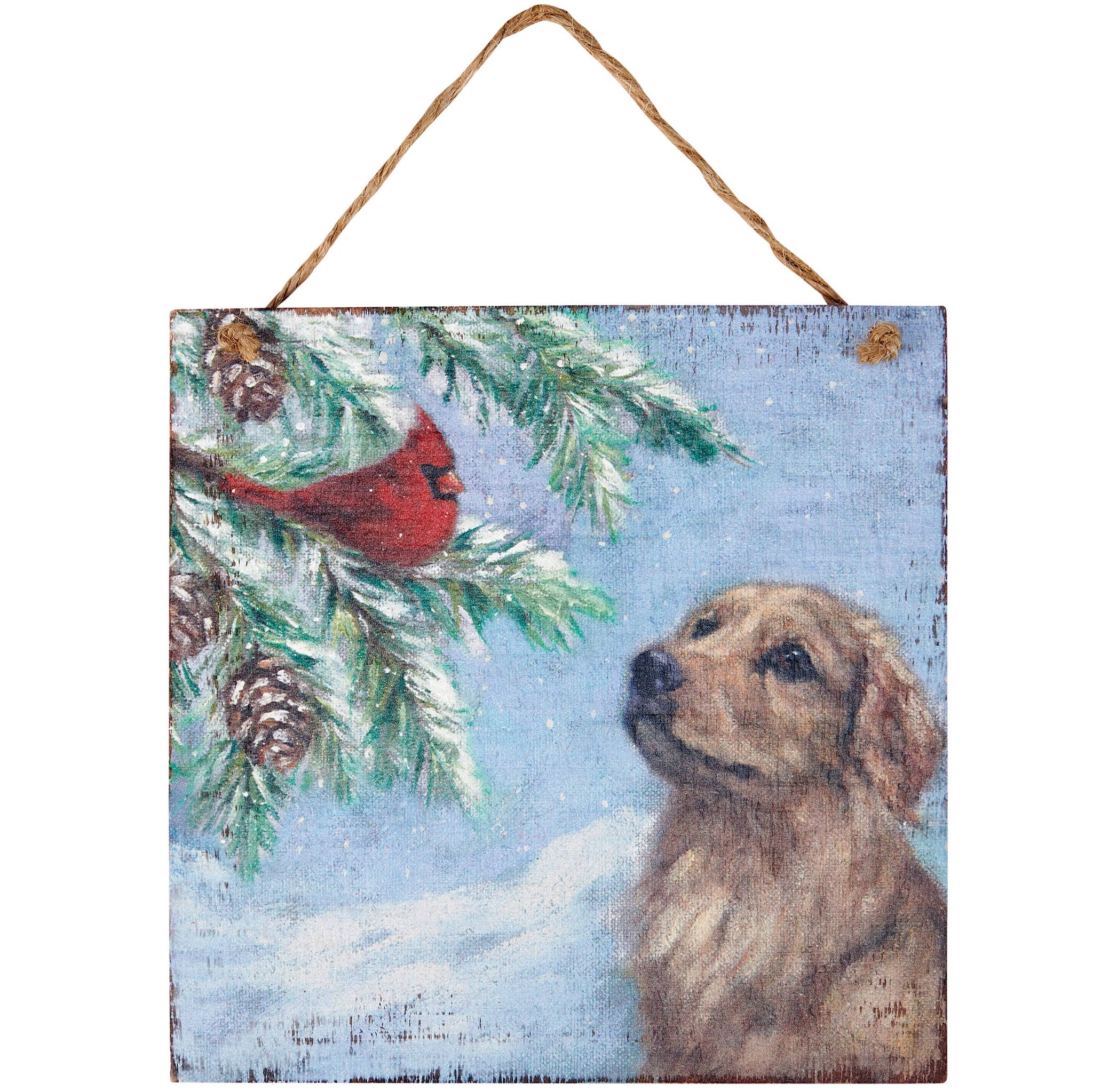 A wooden ornament from our Christmas Collection displaying a charming winter scene of a cardinal and a golden retriever. Design is replicated from original artwork painted onto burlap canvas, giving the art a unique depth and texture. Seasonal ornament features distressed details with coordinating red color on the sides and back. Our Cardinal And Golden ornament is easy to hang for display via attached jute hanger. A rustic winter-themed ornament perfect for seasonal display.
