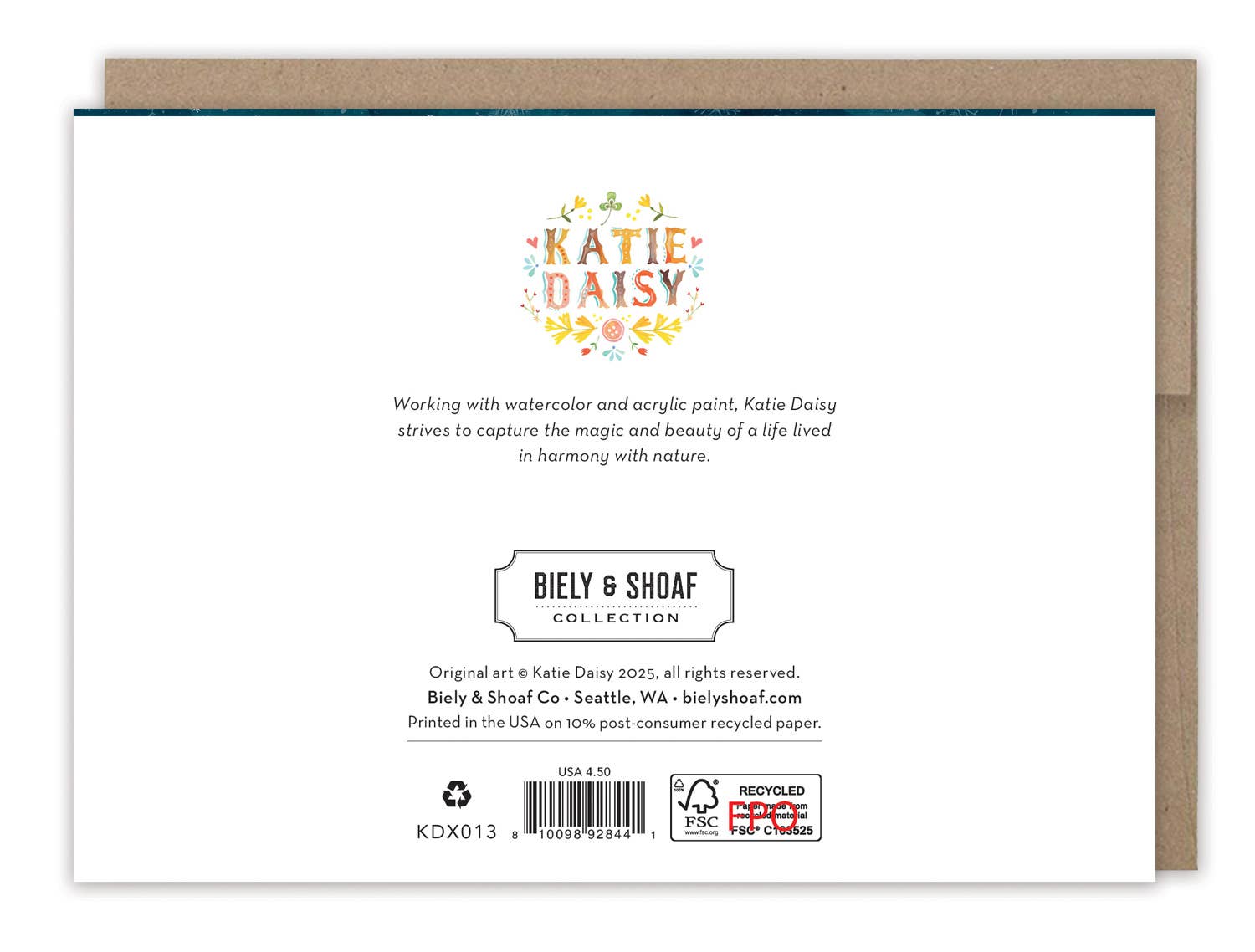 Inside verse: Wishing you a magical holiday. Merry Christmas! • Gold foil details • Illustrated by Katie Daisy • Pre-priced • Size: A6, 4.5" x 6.25" • Paired with Brown Kraft envelope • Printed in the USA • Printed on high-quality FSC-certified 10% post-consumer waste recycled paper • By default cards come without cello packaging. Cello can be added to your order using our cello listing for an additional $0.25 each. • For FREE cello on your first order, please put "FREECELLO" in your order PO, or send us a message! About the artist: Katie Daisy was raised by the birds and warm breezes of small-town Lindenwood, Illinois, brought up among the wildflowers with roots planted deeply in the natural world. Now residing in Sisters, Oregon, Katie continues to infuse her art with the wildflower spirit. Working in watercolor and acrylic paint, Katie strives to capture the magic and beauty of a life lived in harmony with nature.