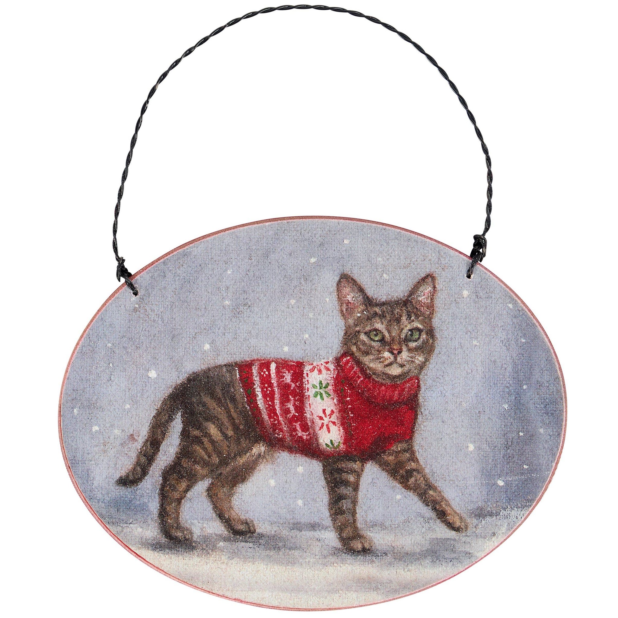 A wooden ornament from our Christmas Collection displaying a holiday cat design featuring a charming tabby cat wearing a cozy Christmas sweater in snowy weather. Holiday cat design is replicated from original artwork painted onto burlap canvas, giving the art a unique depth and texture. Seasonal ornament features distressed details with coordinating red color on the sides and back where it can be personalized with owner's pet name and holiday memories. Our Cozy Tabby Cat ornament is easy to hang for display via attached twisted wire hanger. A rustic holiday gift combining a love of Christmas and pets.