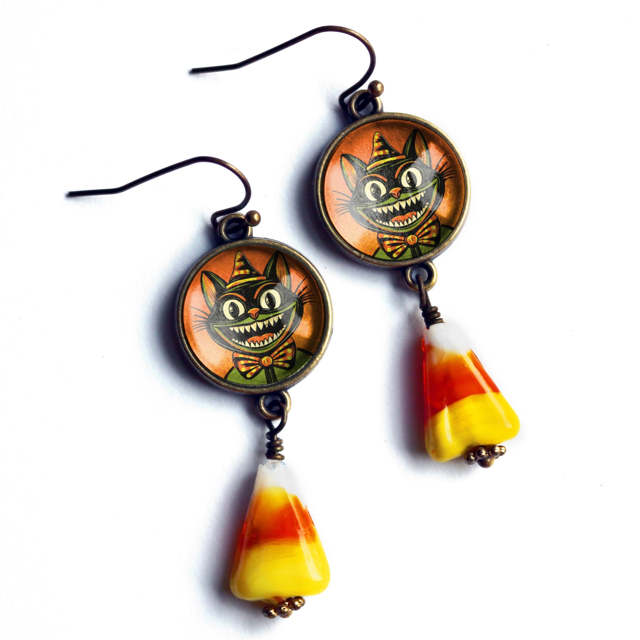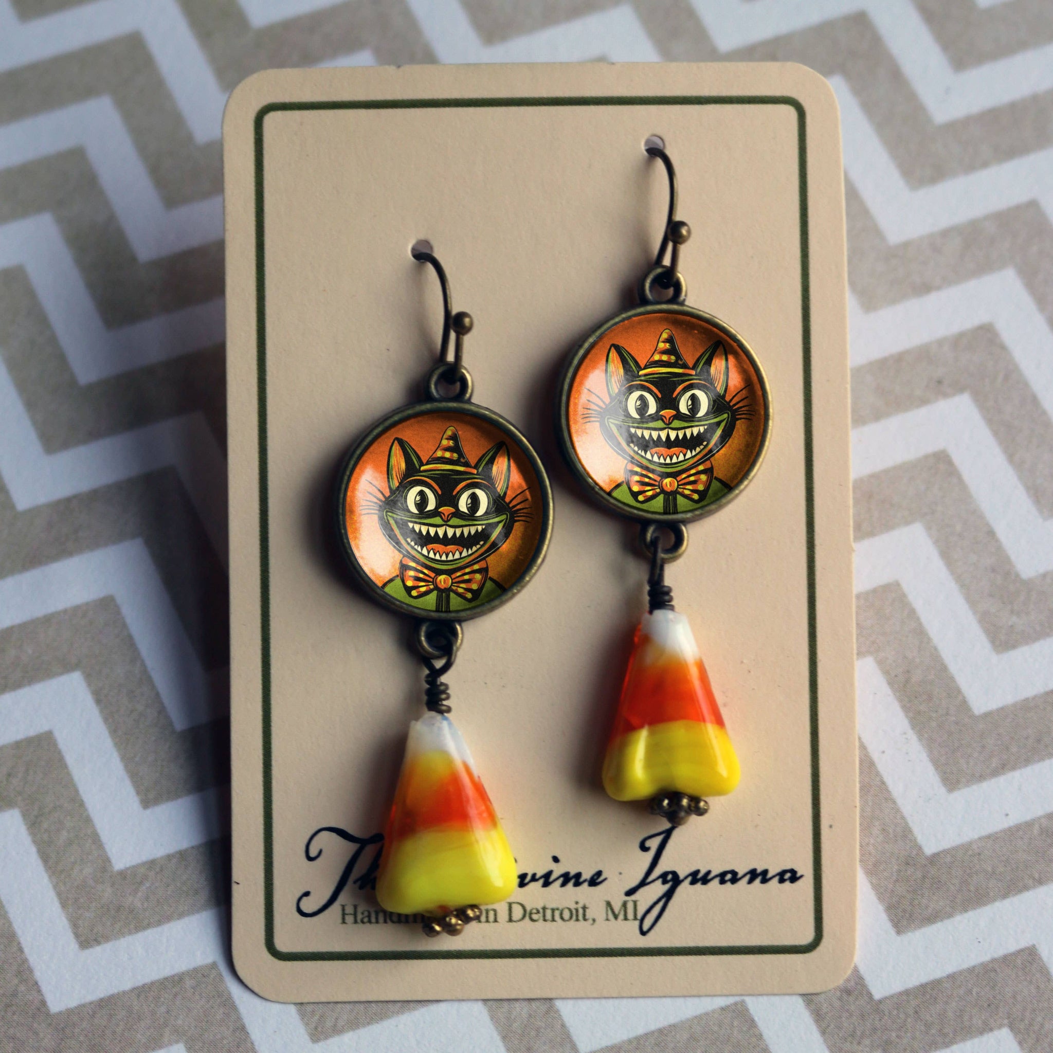 Crazy Cat Retro Halloween Candy Corn Earrings