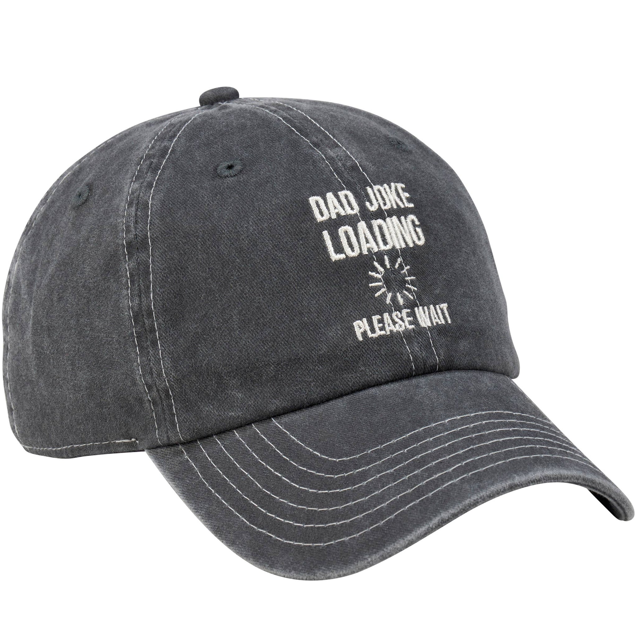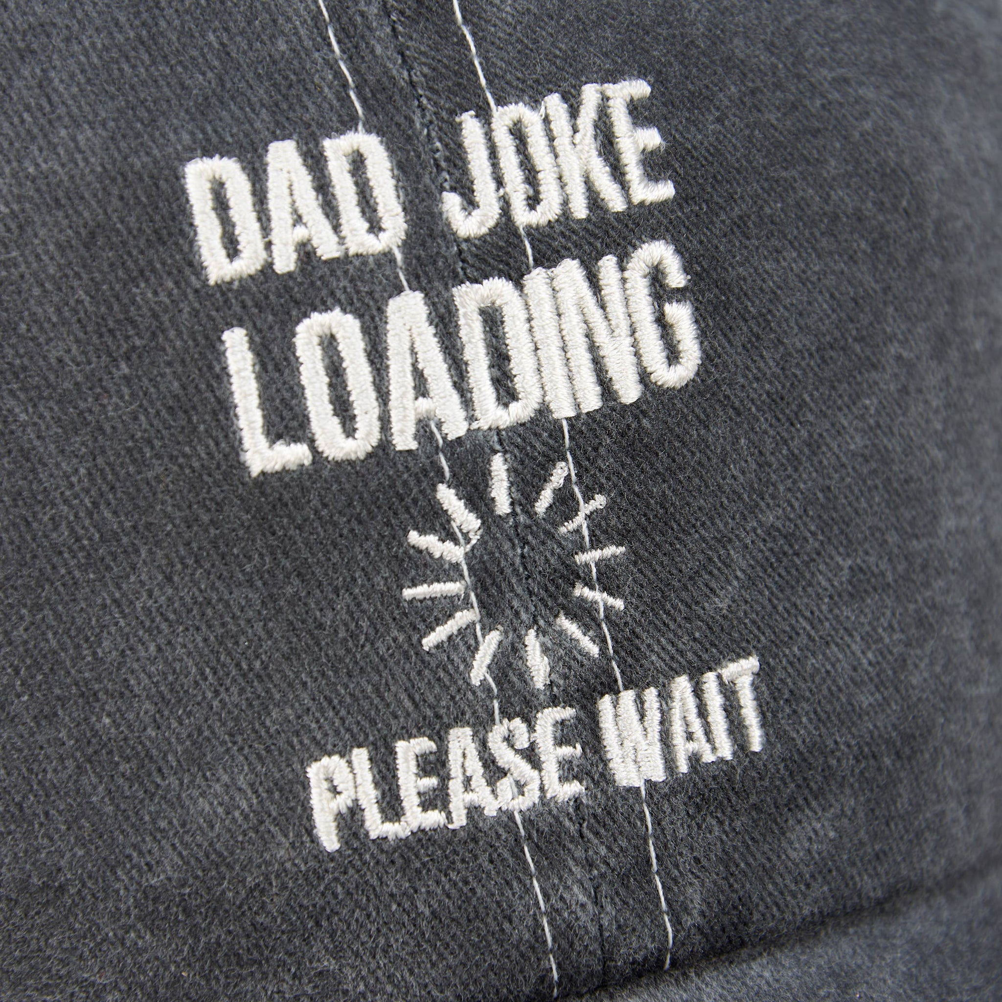 A stonewashed black baseball cap from our Father's Day Collection displaying a humorous sentiment that reads "Dad Joke Loading - Please Wait" with loading wheel design in between phrases. Cap features embroidered sentiment and designs for added detail. Our Dad Joke hat is one size fits most with an adjustable buckle closure to create the perfect fit. A fun accessory to wear for everyday use. Hand wash only.