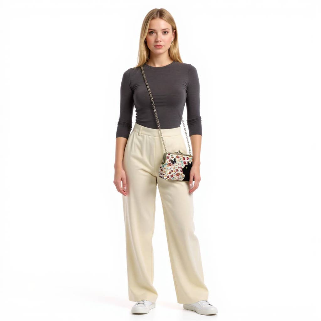 Add a touch of charm to your accessories with the Floral Black Cat Kisslock Bag, a beautifully designed piece featuring a soft velvet black cat, delicate butterflies, and elegant floral embroidery. This vintage-inspired bag is perfect for those who appreciate detailed, unique designs with a classic feel. ✨ Features: Black cat and butterfly crafted from soft velvet material Vintage metal detailing Uniquely embroidered floral design for a vintage look Kisslock closure Polkadot fabric lined interior Interior zippered pocket Can be used as a handheld bag or shoulder bag Includes a detachable 5in faux leather strap and a detachable 26in chain strap Crafted from a high quality cotton and linen blend material Measures approximately 9.5in (L) × 1.5in (W) × 7in (H) ✨ Perfect For: Cat lovers and collectors Vintage-inspired fashion fans Gifting to anyone who enjoys detailed and artistic accessories Keywords: Black cat kisslock bag, floral cat purse, velvet cat handbag, vintage embroidered bag, cotton linen