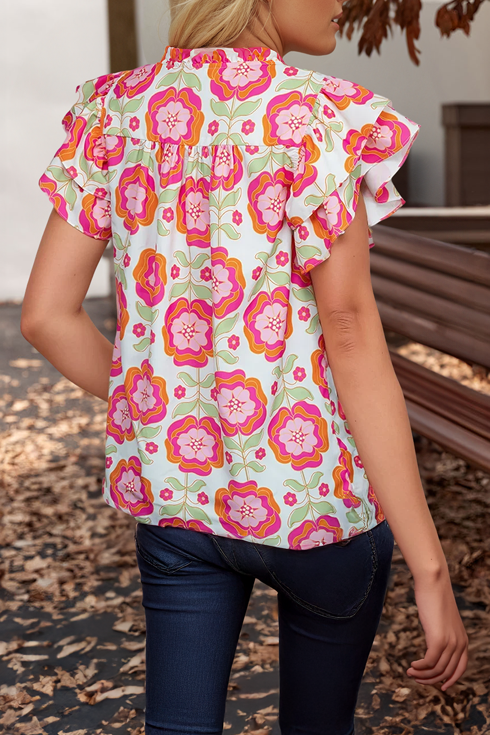 Floral Ruffle Sleeve Ric-Rac Trim Split Neck Blouse (S-XL): Multi-Colored / Missy / L