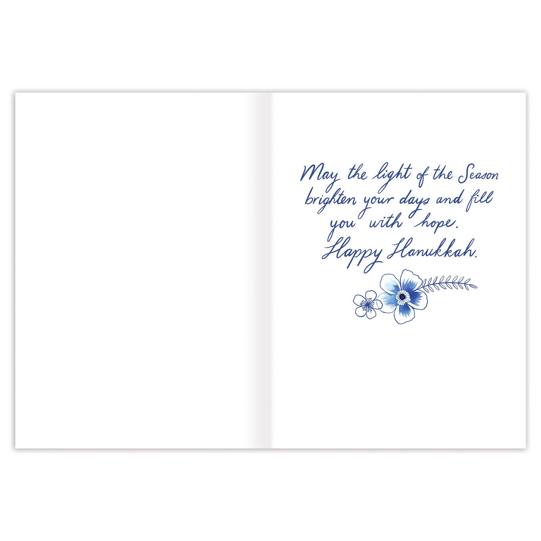 Inside verse: May the light of the season brighten your days and fill you with hope. Happy Hanukkah