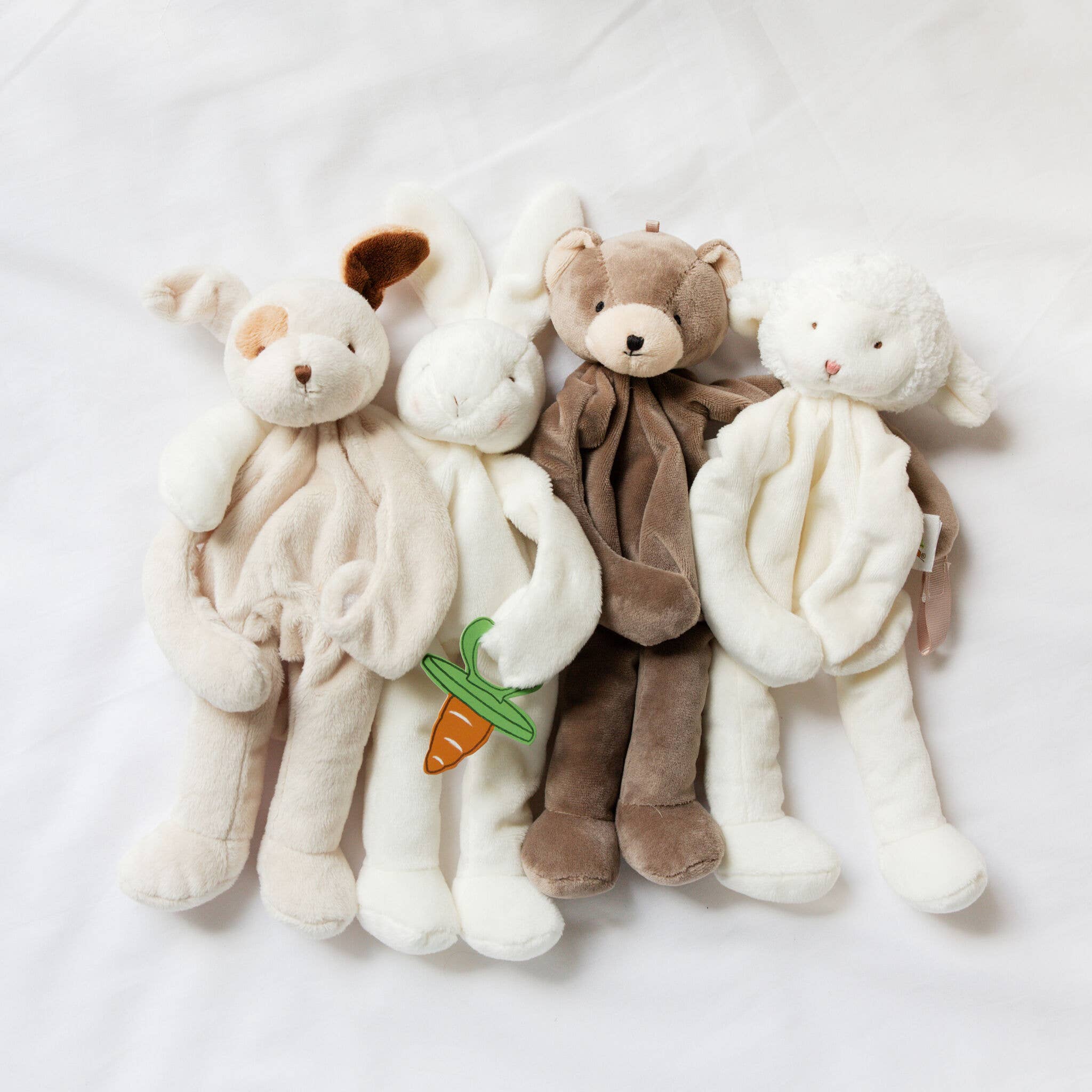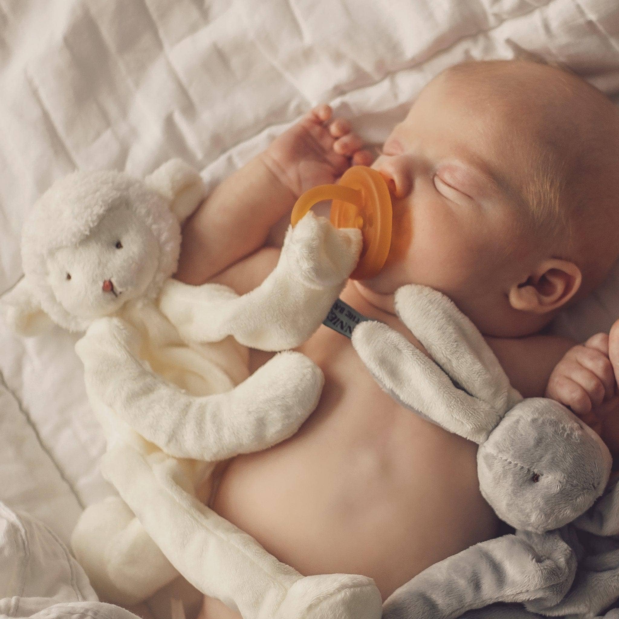 Our Kiddo Silly Buddy animal pacifier holder is a fuzzy, furry lamb whose playful embroidered face smiles from atop a cozy warm-white velour body. Kiddos long, huggable arms and legs are ever-so-lightly stuffed, making them easy for baby to grasp and so comforting to hold onto. With pacifier holder hand loop and fun rattling head, this is sure to be a favorite security item of Baby and Mom and Dad alike!
