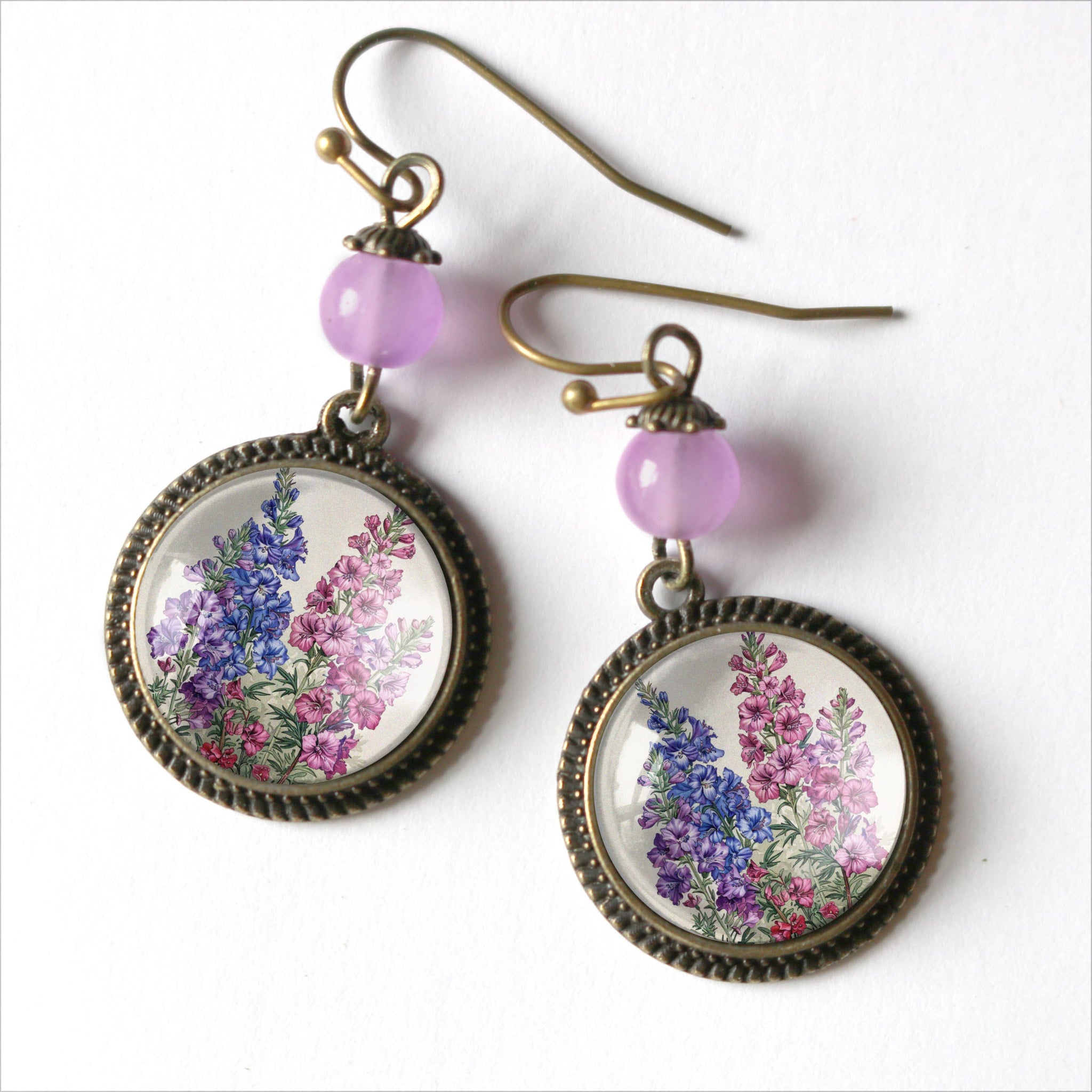 Larkspur / Delphinium Flowers Glass Cabochon Earrings