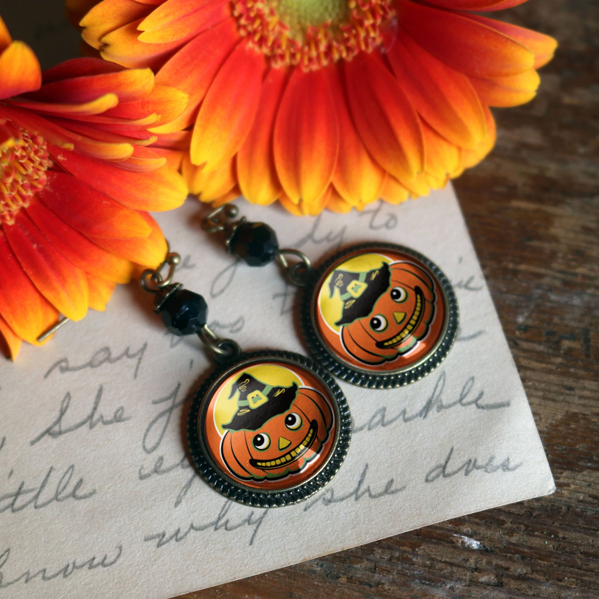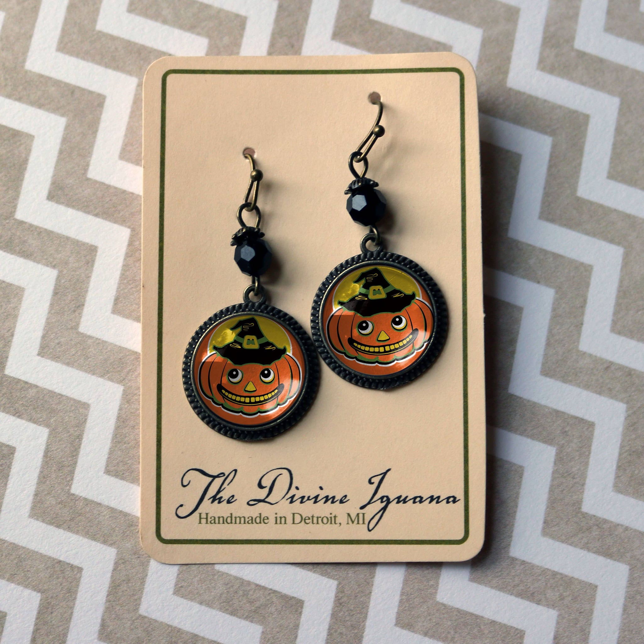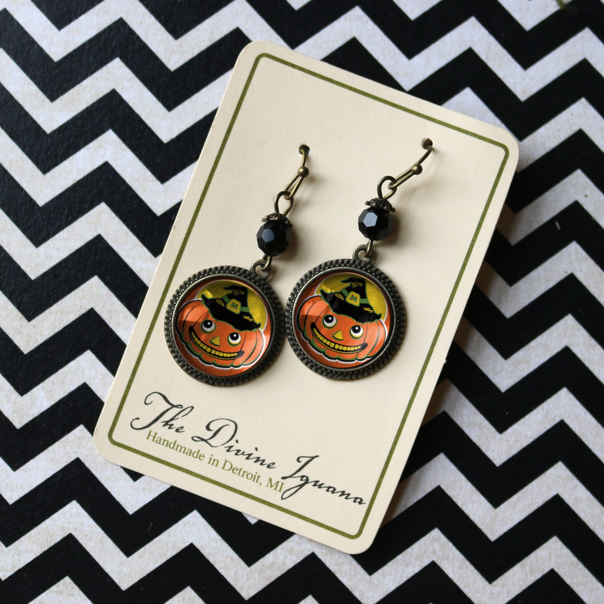 A best seller for the Fall and Autumn, vintage inspired Jack O Lanterns in witch hats are a whimsical addition to your holiday displays. Lightweight earrings have an antiqued bronze finish for a warm, heirloom appearance with lovingly handmade reversed decoupage glass cabochons in elegant base metal findings. *Nickel-free bronze ear wires and backs. *Dangle Earrings are about .75" by 1.5" with accent bead. *Image area 5/8" (16mm about the size of a dime). *Earrings arrive carded inside a chipboard gift box with the Diving Iguana logo. If you would prefer your earrings arrive without this packaging, please let us know. Divine Iguana Earrings are packaged so that their backing cards fit neatly inside our chipboard gift boxes.