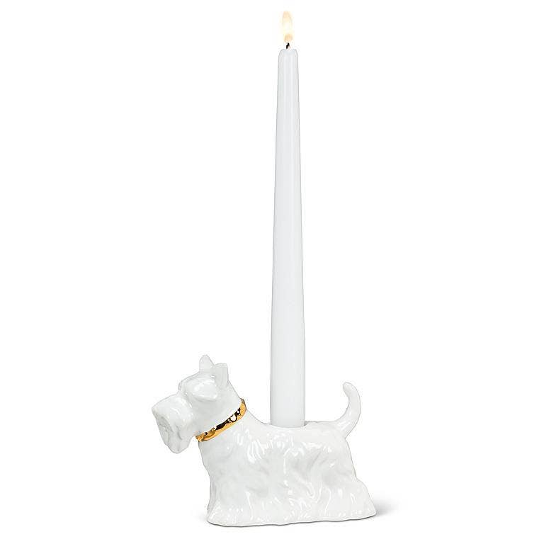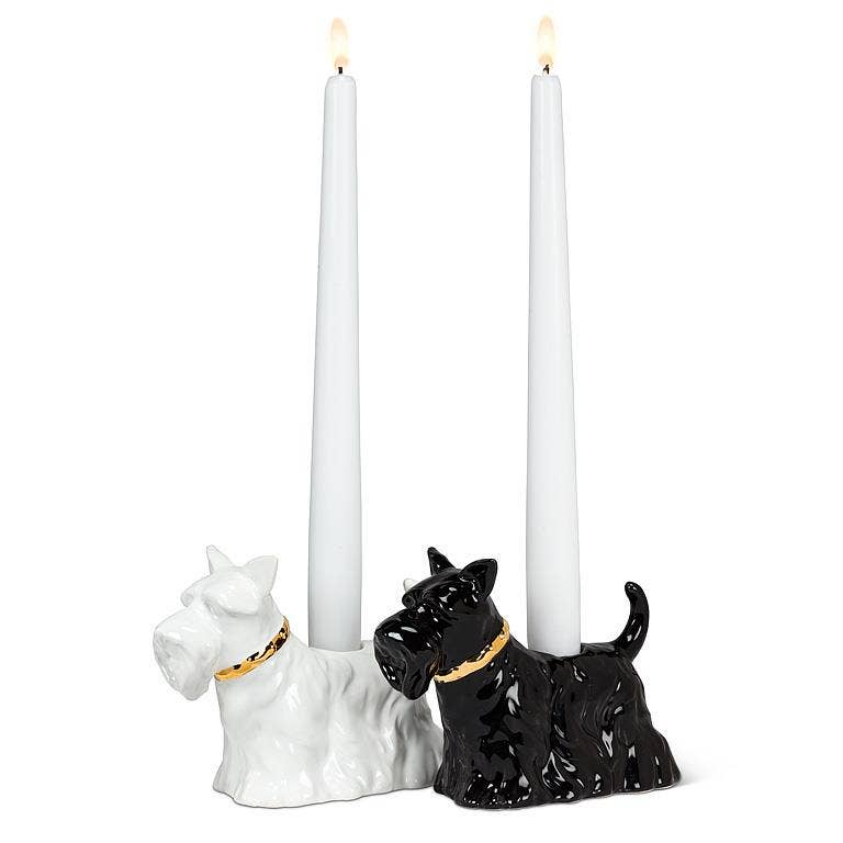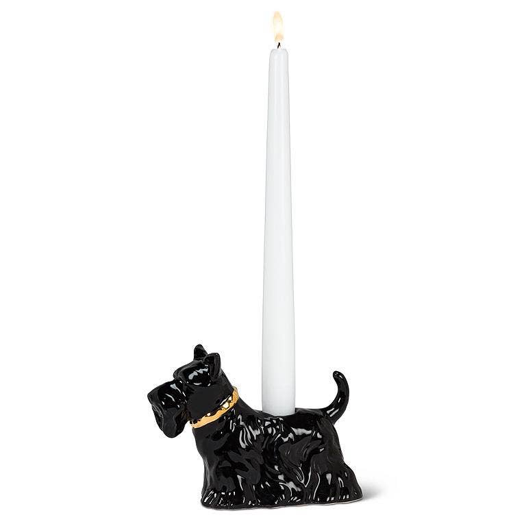 Add some adorable charm to your decor with this ceramic Scottie Dog Taper Holder. Measuring 6" long, this beautifully detailed piece captures the beloved Scottish Terrier in a glossy finish, complete with a refined gold-tone collar for extra sophistication. This playful piece that adds warmth and personality to any home!