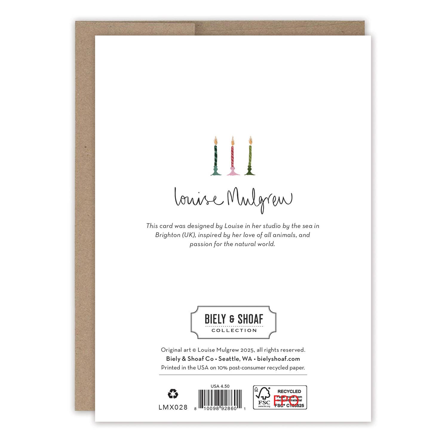 Inside verse: Wishing you a warm and cozy holiday • Gold foil details • Illustrated by Louise Mulgrew • Pre-priced • Size: A6, 4.5" x 6.25" • Paired with Brown Kraft envelope • Printed in the USA • Printed on high-quality FSC-certified 10% post-consumer waste recycled paper • By default cards come without cello packaging. Cello can be added to your order using our cello listing for an additional $0.25 each. • For FREE cello on your first order, please put "FREECELLO" in your order PO, or send us a message! About the artist: Working with gouache and watercolor, Louise designs in her tiny studio in Brighton, England, inspired by her love of all animals, and passion for the natural world. Louise was named 2023 Artist of the Year by the USA Greeting Card Association.