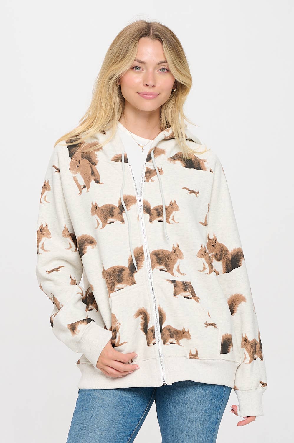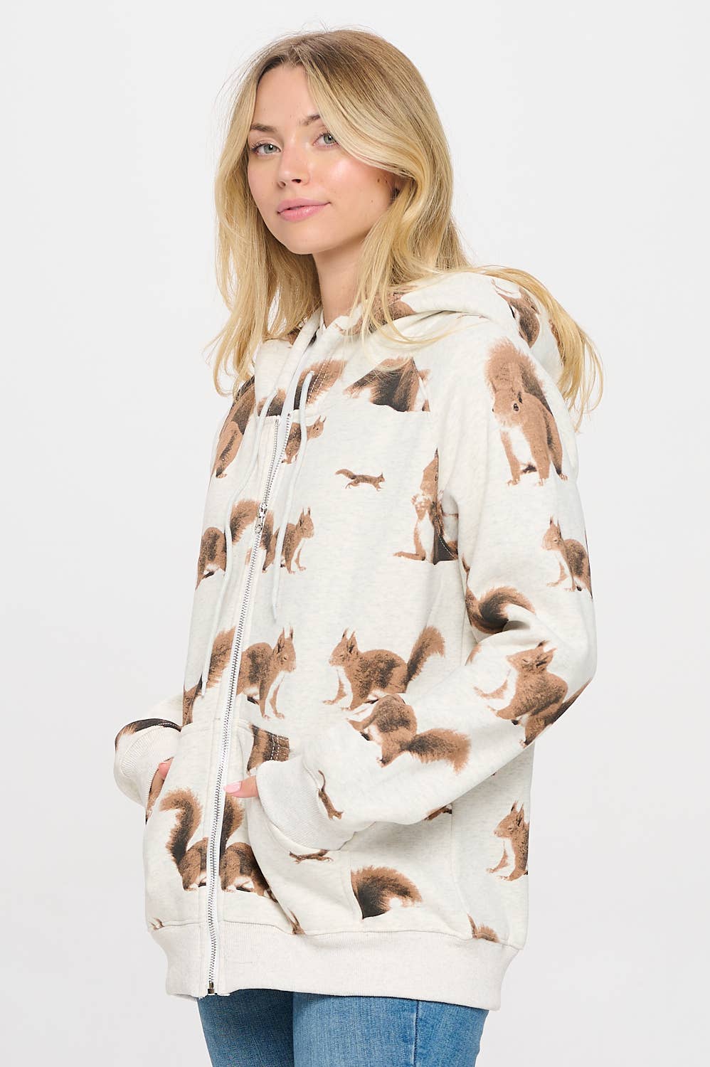 SQUIRREL PRINT ZIP UP HOODIE 70% COTTON, 28% POLYESTER, 2% SPANDEX