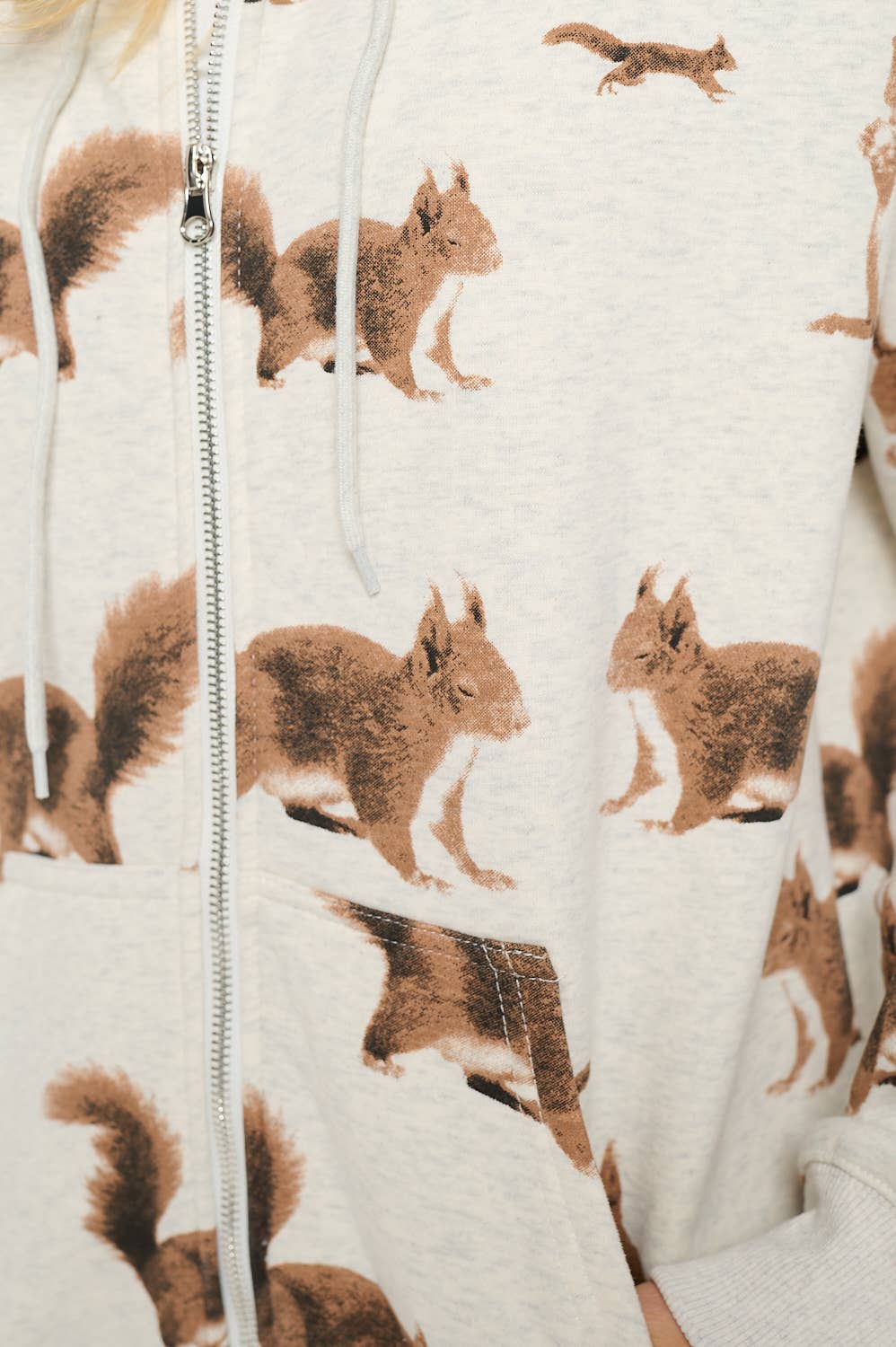 SQUIRREL PRINT ZIP UP HOODIE 70% COTTON, 28% POLYESTER, 2% SPANDEX