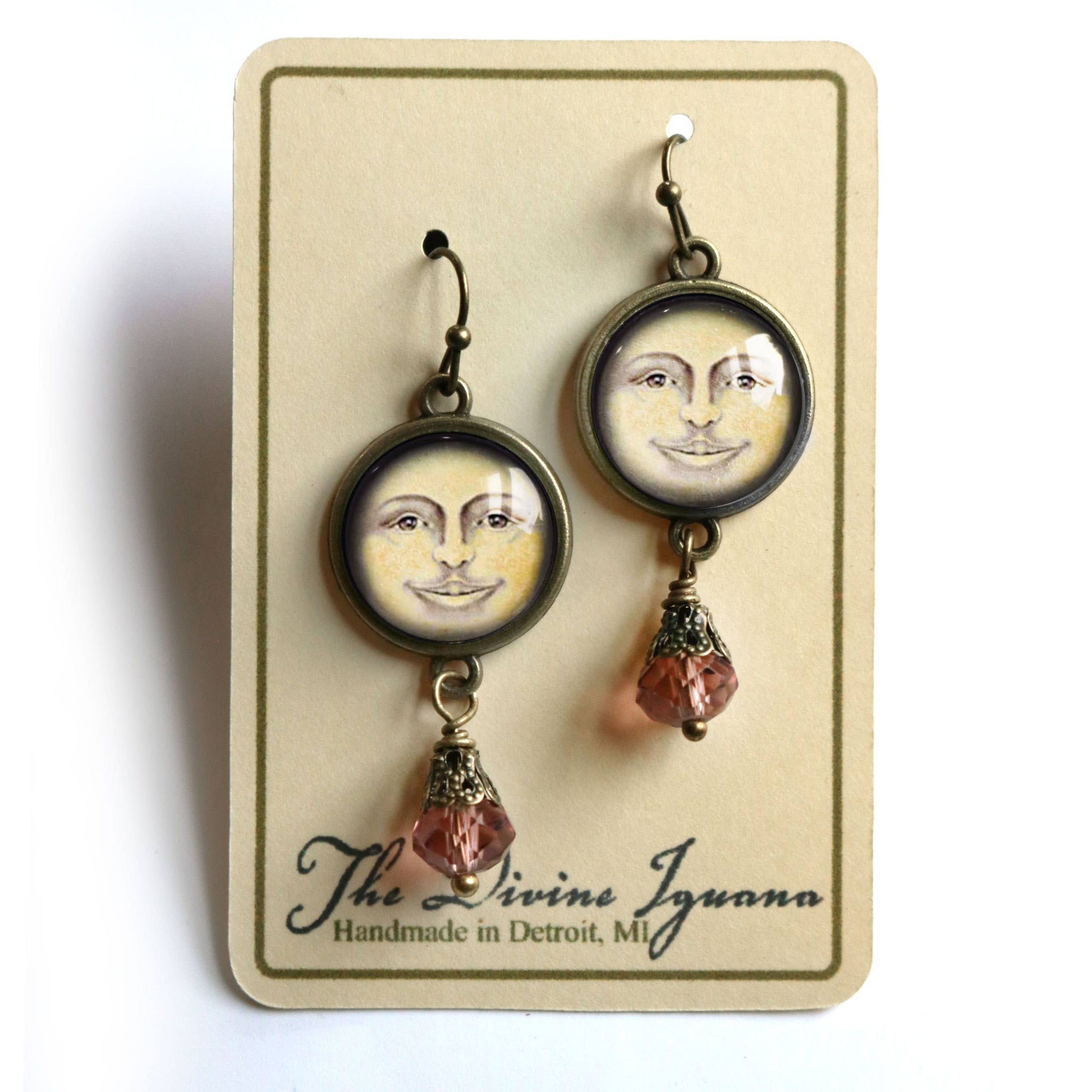 Victorian Man in the Moon Glass Cabochon and Bronze Earrings