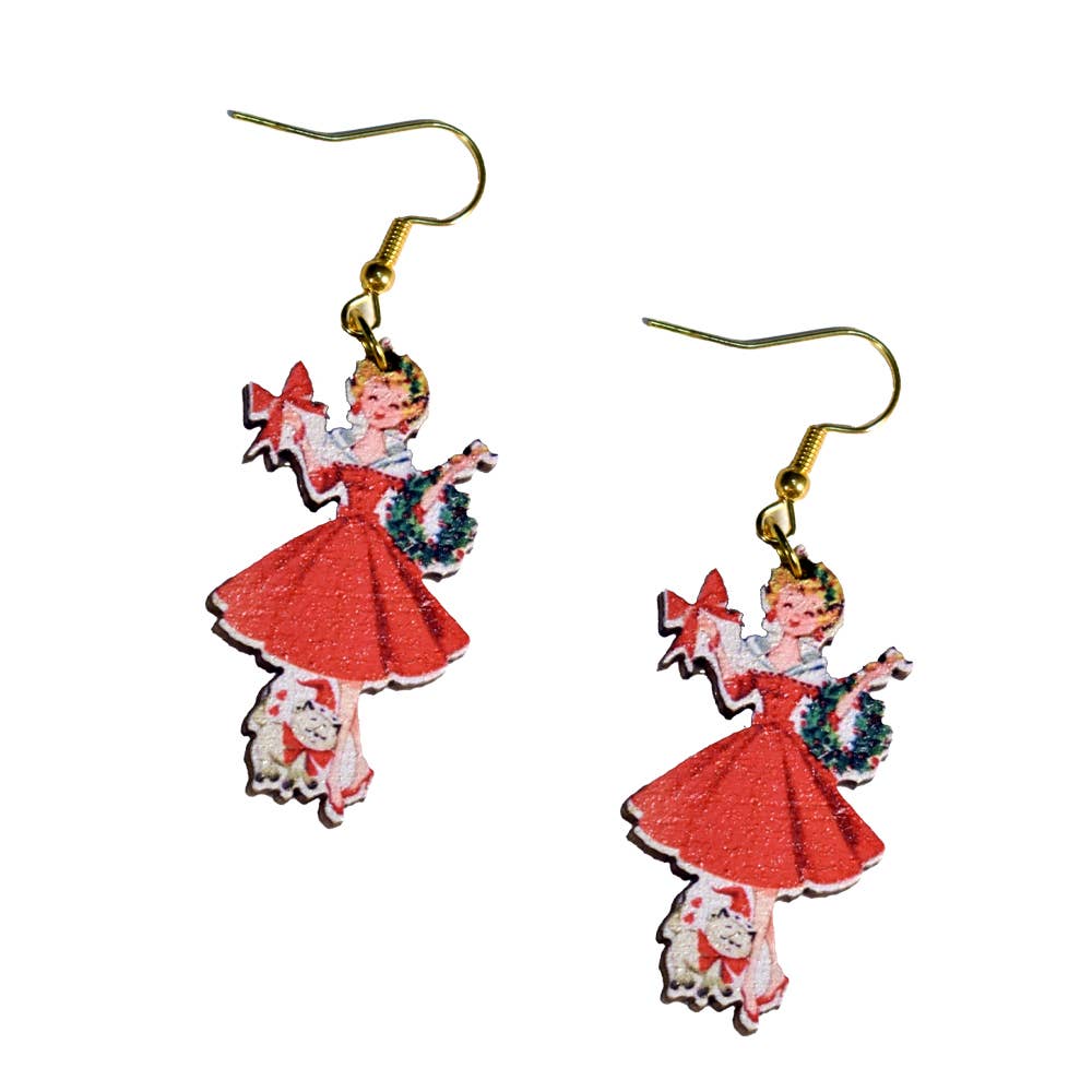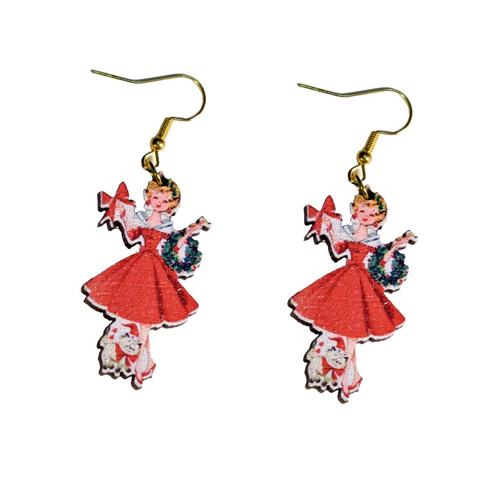 Vintage Christmas Lady with Cat Earrings